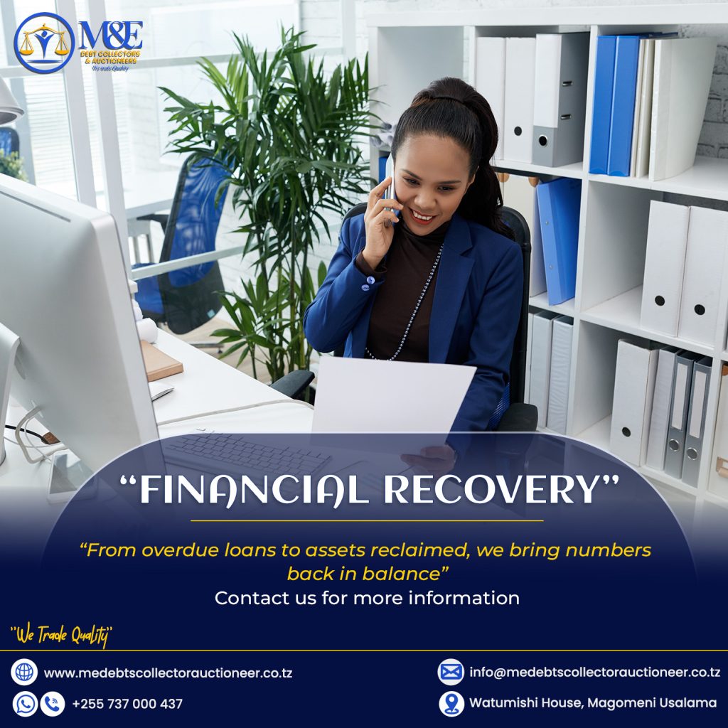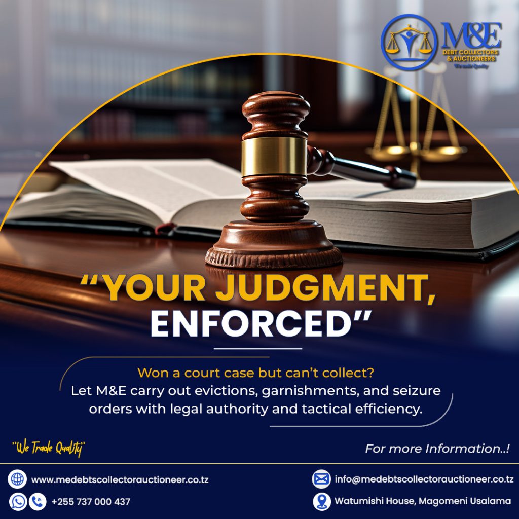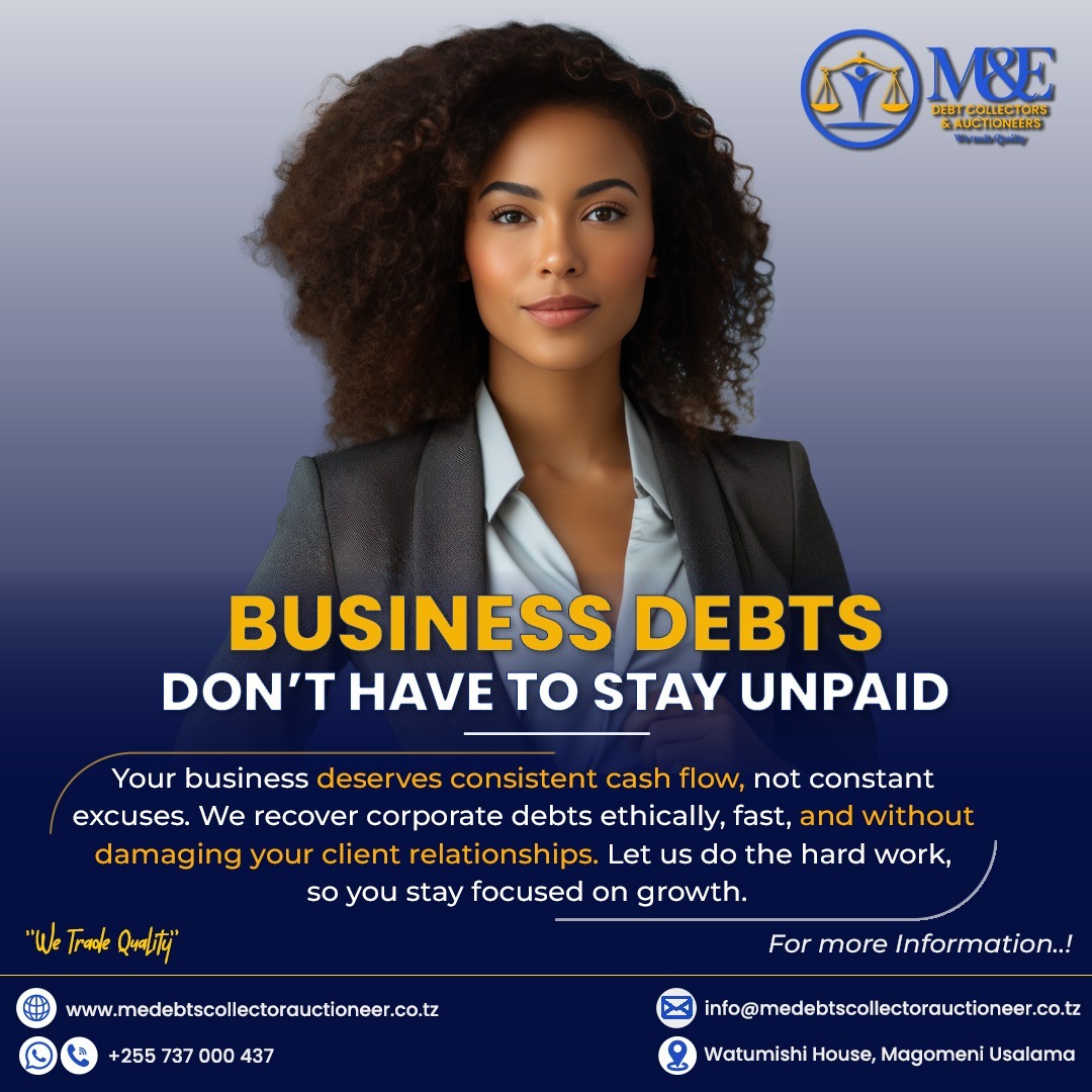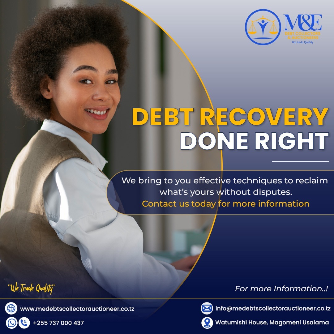 M&E debt collectors and Auctioneers (T) Limited is a company owned by Tanzanian Directors with relevant experience in the industry. It is licensed by Ministry of finance to undertake debts collection services and public auctioneering. It is also registered to the High court of Tanzania as a court broker to undertake realization of charged security, execution of court orders and carrying out eviction orders and other forms of execution as instructed by Court of Republic of Tanzania. In additions to the above service, we execute repossession of lawful.. Read More >>>